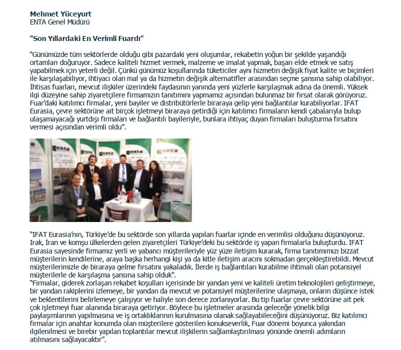 “IFAT Eurasia’nın, Türkiye’de bu sektörde son yıllarda yapılan fuarlar içinde en verimlisi olduğunu düşünüyoruz. Irak, İran ve komşu ülkelerden gelen ziyaretçileri Türkiye’deki bu sektörde iş yapan firmalarla buluşturdu. IFAT Eurasia sayesinde firmamız yerli ve yabancı müşterileriyle yüz yüze iletişim kurarak, firma tanıtımımızı bizzat müşterilerin kendilerine, araya başka herhangi kişi ya da kitle iletişim aracını sokmadan gerçekleştirebildi. Mevcut müşterilerimizle de bir araya gelme fırsatını yakaladık. İlerde iş bağlantıları kurabilme ihtimali olan potansiyel müşterilerle de karşılaşma şansına sahip olduk”.